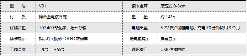 V3五代屏顯版,鋅鋁合金電鍍外殼,聚合特鋰電池,12萬條記錄超大存儲(chǔ), 24組鬧鈴提醒巡邏,OLED顯示屏,陽光下也能清晰顯示。