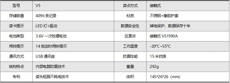 通體304不銹鋼,接觸式巡更棒,擁有讀頭短路不耗電專利,50米30次以上跌落仍正常使用。