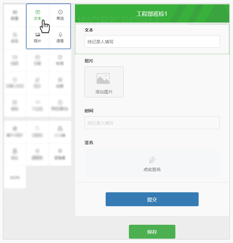 設(shè)計設(shè)備或場所的工單時,可自定義要檢查的項目, 可添加:單選、多選、數(shù)值、視頻、照片、時間、拍照、表格、多列、下拉框等,滿足企業(yè)多樣化需求。